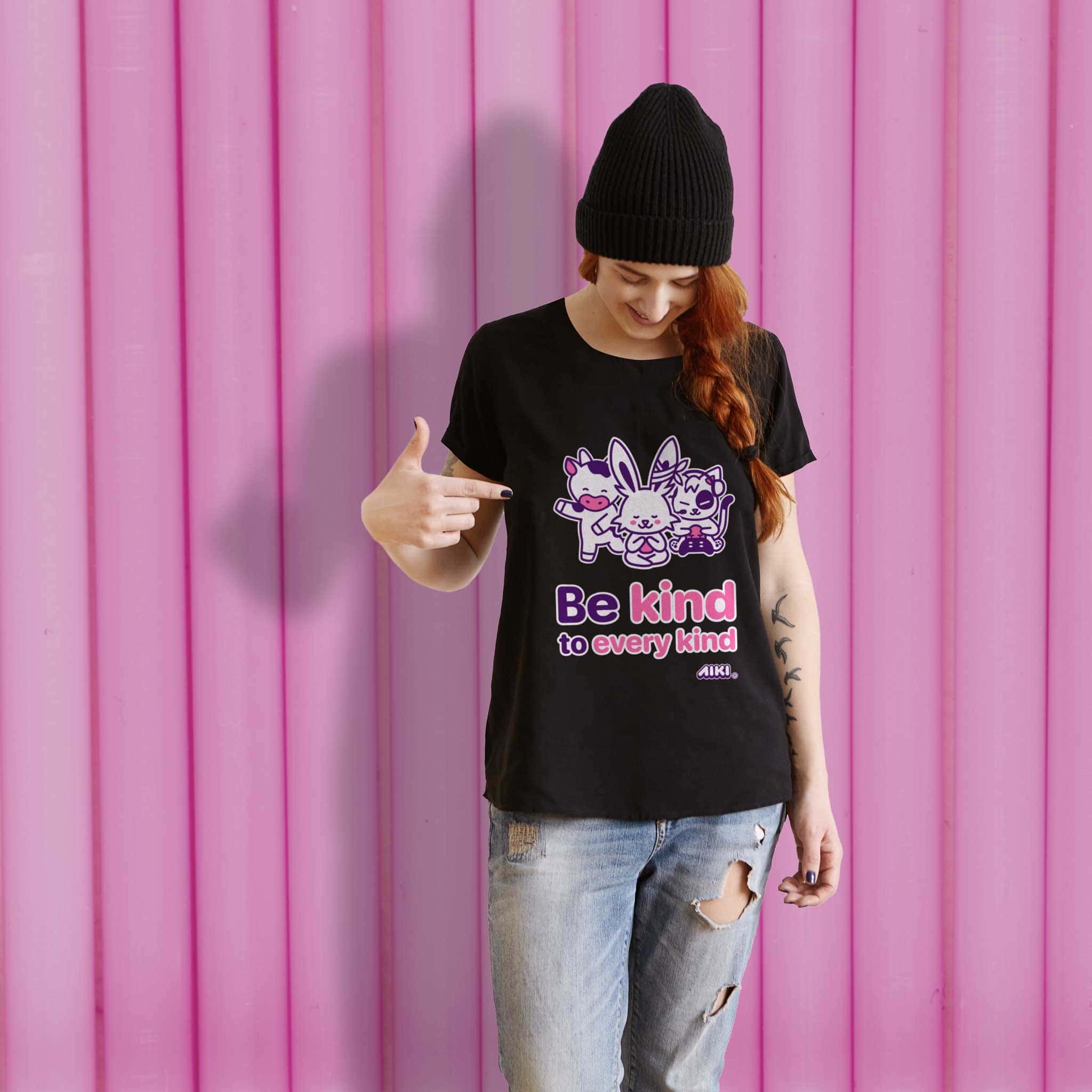 Polera Be Kind To Every Kind, en suave tela negra con estampado en el frente a color que incluye diferentes animalitos 💕Esta polera está en talla S,M y L.