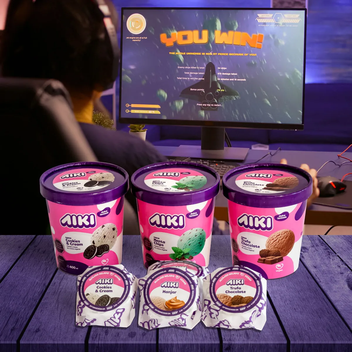 Para pasar la noche jugando o para compartir. Pack de 3 Helados Artesanales Aiki de 400 ml y 4 Alfajores Helados Aiki. Sabores a elección.